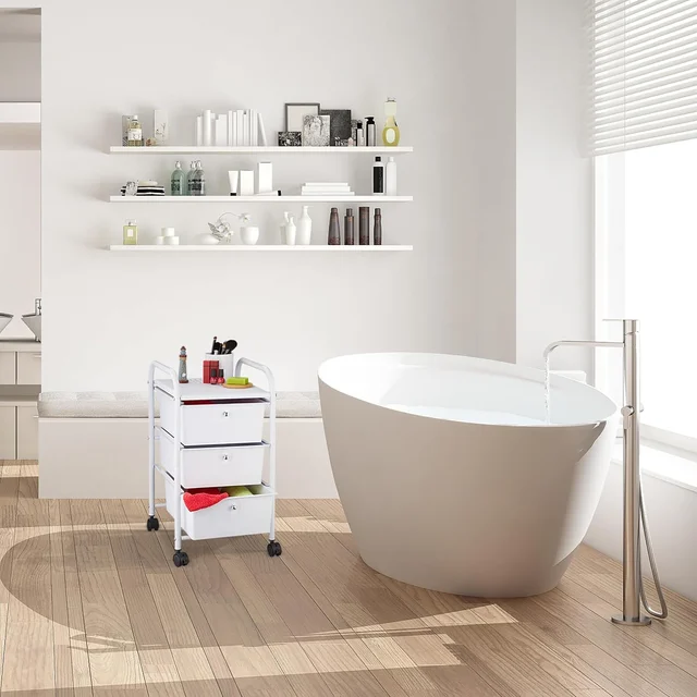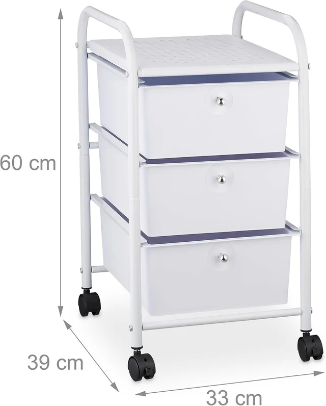 – Relaxdays Carrito Auxiliar, 3 Cajones, Metal y Plástico, Carro para Baño, Cosméticos, 60 x 33 x 39 cm, Blanco